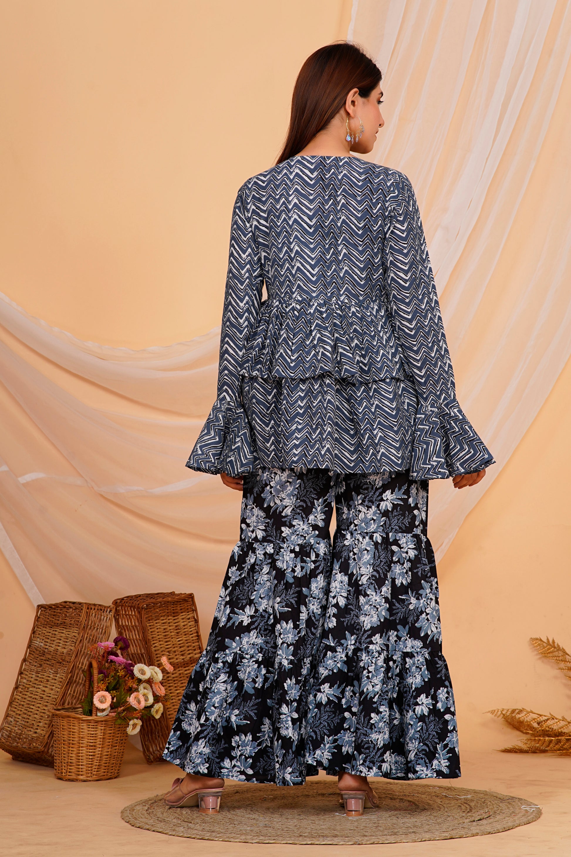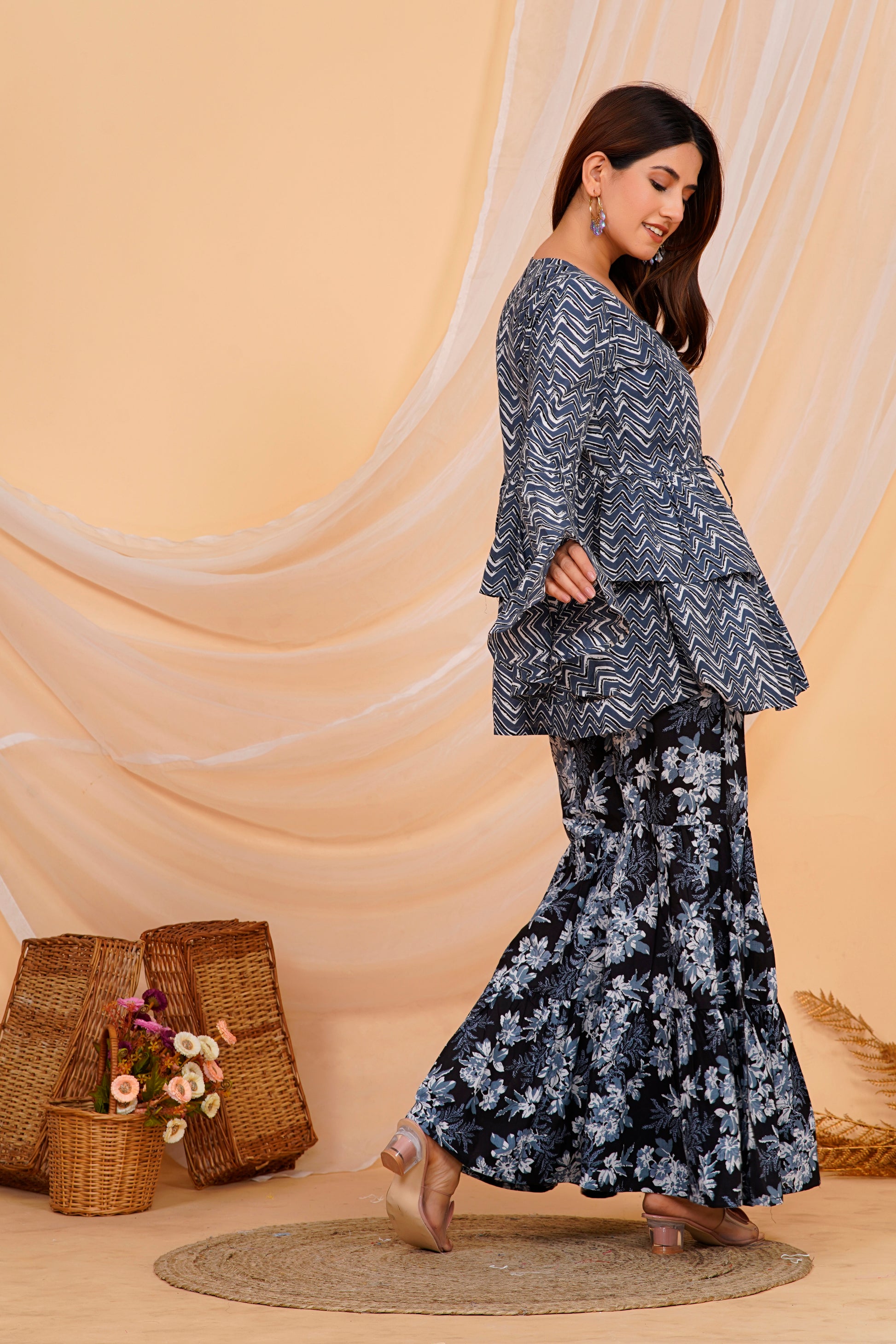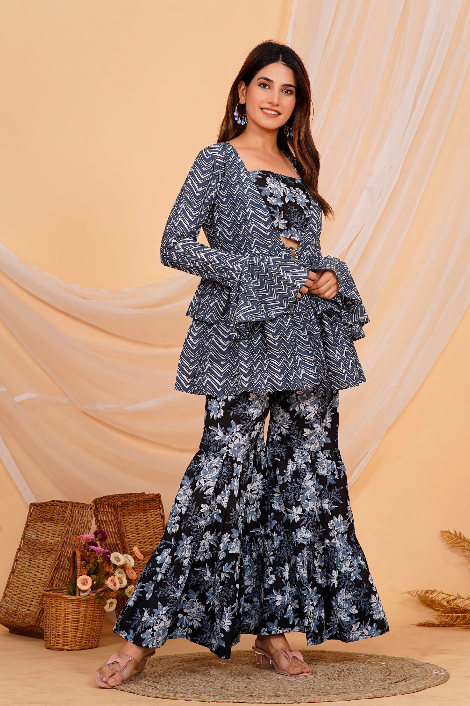 set combines traditional comfort with modern design. The top features a chic zigzag pattern with flared sleeves and a tied front, offering a contemporary twist on classic style. Paired with wide-legged floral printed pants, this outfit is perfect for casual gatherings or festive occasions. The lightweight cotton fabric ensures comfort and breathability, making it ideal for all-day wear.