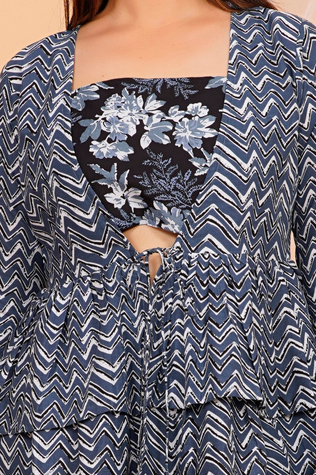 - Top: Zigzag print with tie-front detailing and flared sleeves